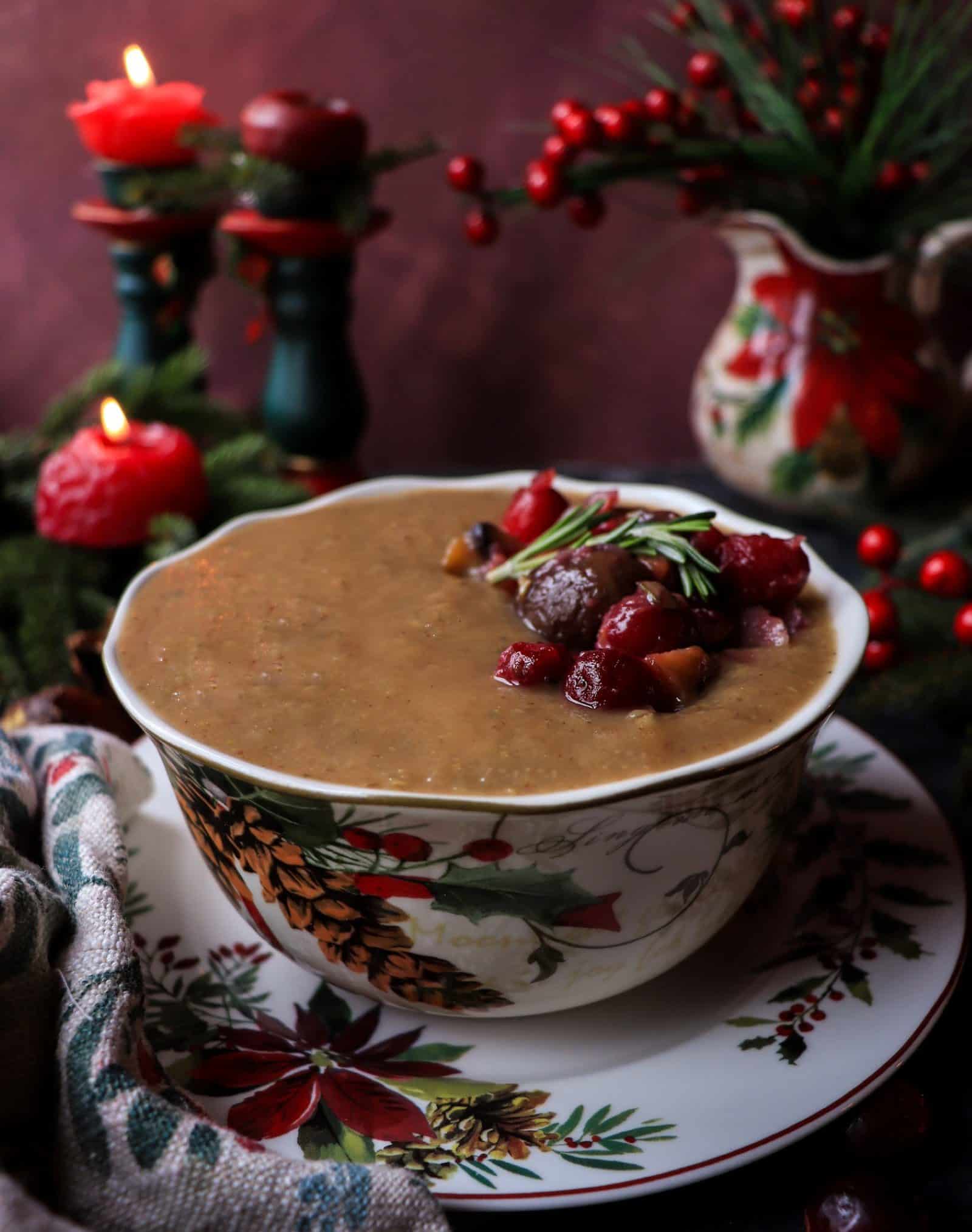 Garnish the soup with some Cranberry Chestnut Relish and enjoy a stunning bowl of soup.