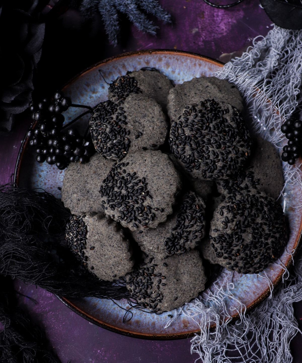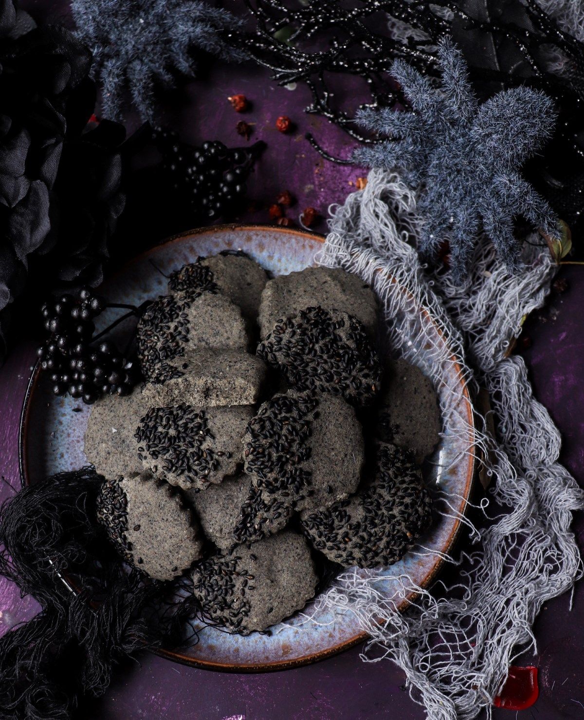 These Black Sesame Shortbread Cookies are irresistibly crumbly, delicate, nutty, and tasty. And their appearance makes them a perfect Halloween dessert!