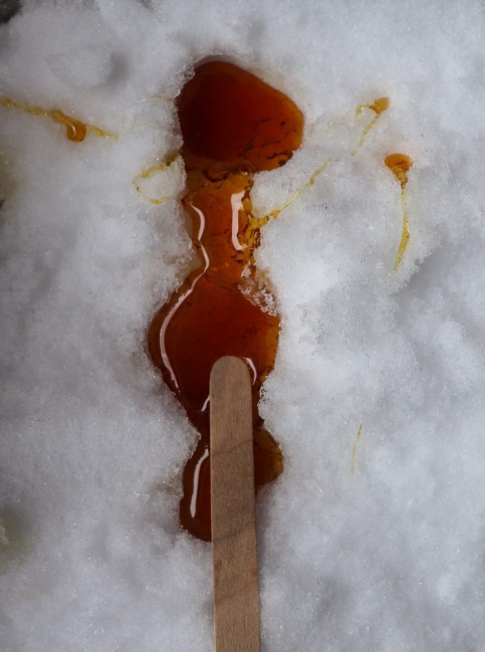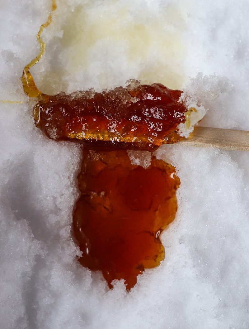 The recipe is simple. Basically, you need to cook the pure maple syrup until it reaches the soft ball stage (235º -240ºF). Then you need to pour the boiling maple syrup on a clean bed of snow. The cold snow instantly stops the syrup from cooking and cools it to the consistency of taffy in seconds. If there’s no snow in your area, the finely grated ice would do.