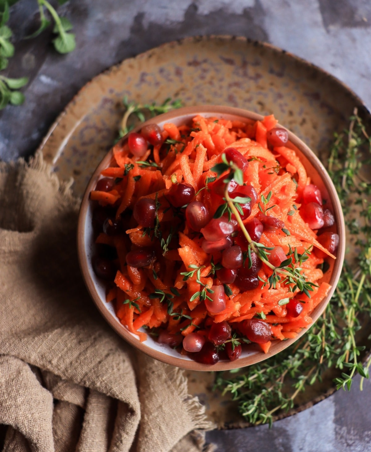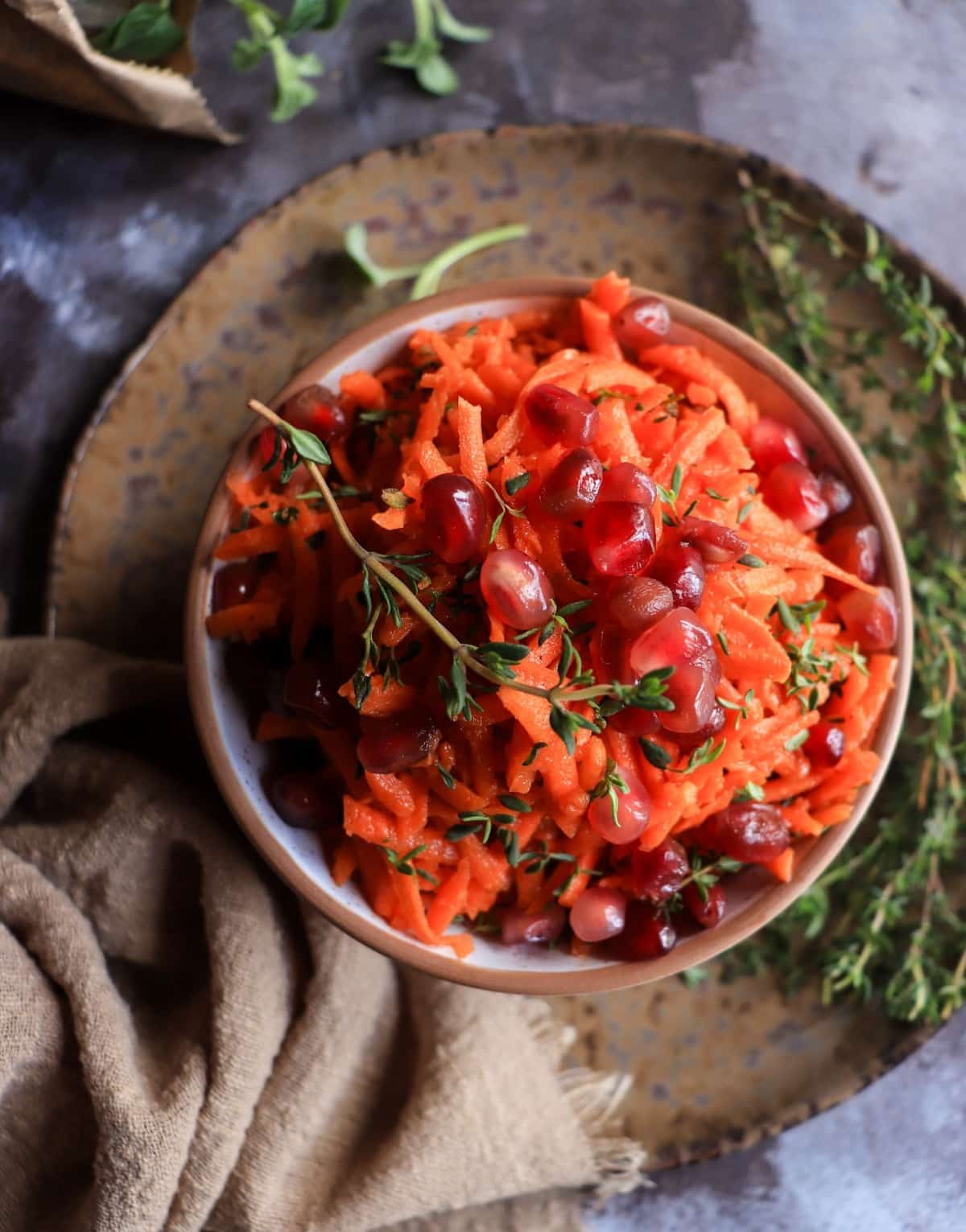 This Carrot Salad with Pomegranate Molasses Dressing is bright, tangy, and deeply flavourful, made with finely shredded carrots tossed in a bold pomegranate molasses vinaigrette with olive oil, apple cider vinegar, and fresh thyme.