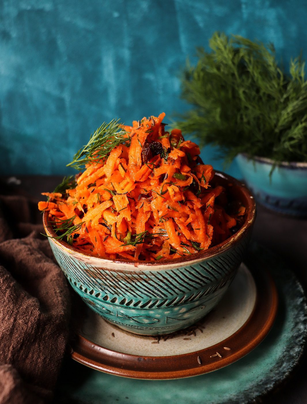 But joking aside, this Carrot Salad with Caraway Seeds and Dill is quite different from a classic carrot salad. The main difference make the caraway seeds. They have a prominent flavour – nutty, bittersweet, fresh, and somewhat with anise and citrus notes. It pairs well with dill. However, since the flavour of caraway seeds is quite bold and strong, you may want to adjust the amount to your liking.