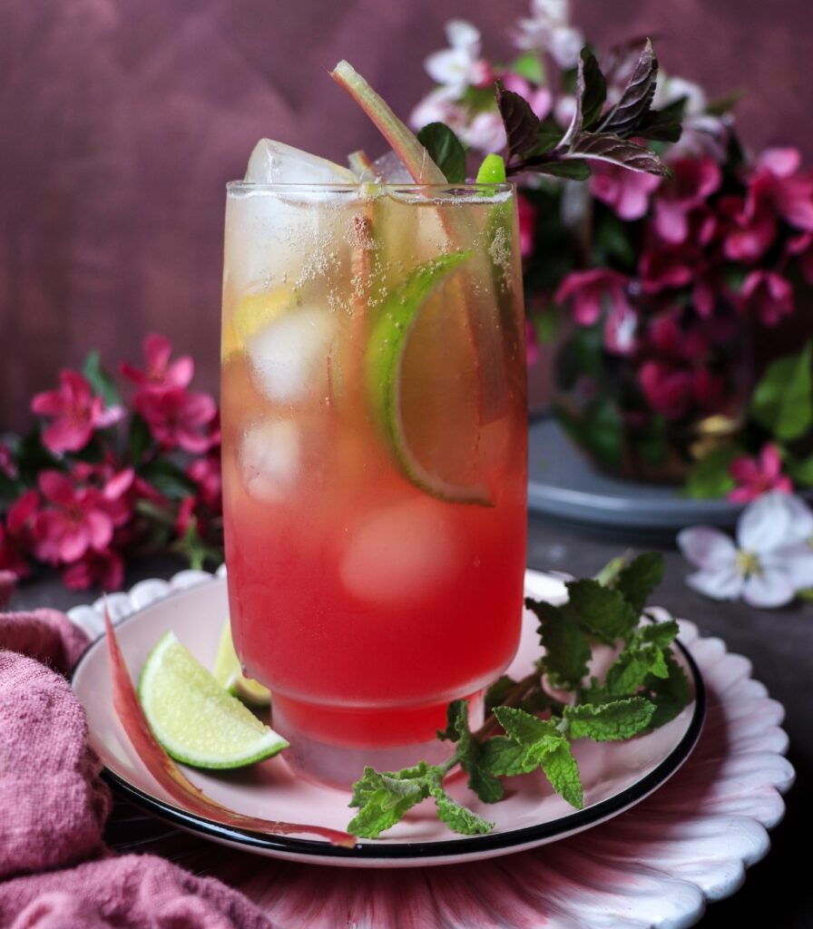 This fresh and luscious Rhubarb Lemonade recipe is easy to make and fun to enjoy on a hot summer day. Rhubarb is cooked down to create the base syrup, which is then combined with lime and mint for an ultimately refreshing experience.