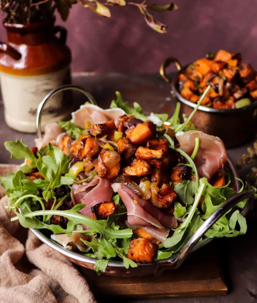 This Roasted Sweet Potato Salad with Caramelized Onions and Prosciutto celebrates the best of cold-weather comfort. Sweet, earthy roasted potatoes pair beautifully with savoury, salty prosciutto and rich caramelized onions, all balanced by peppery arugula and smoky spices.