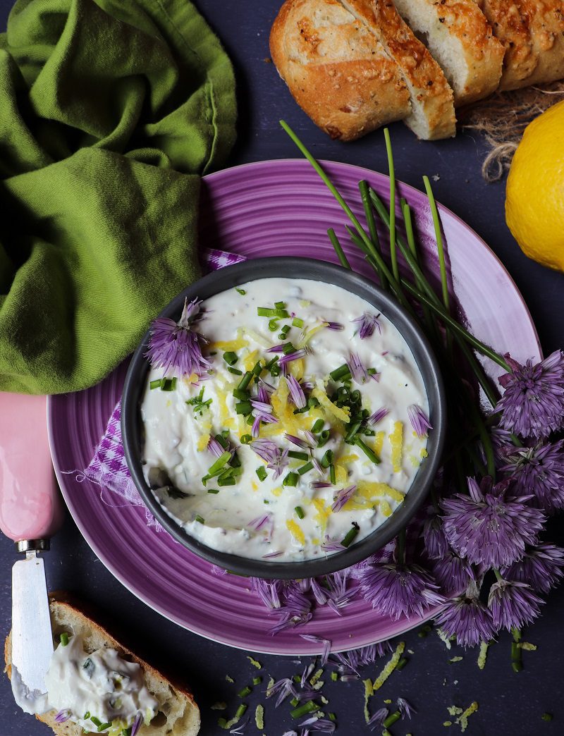In a meantime, I cannot stop sharing recipes with chives and chive blossoms. Previously I posted this Chive Blossom Butter, Chive Sour Cream Dip, and Egg Chive Salad. And here we go – another chive recipe, another dip.