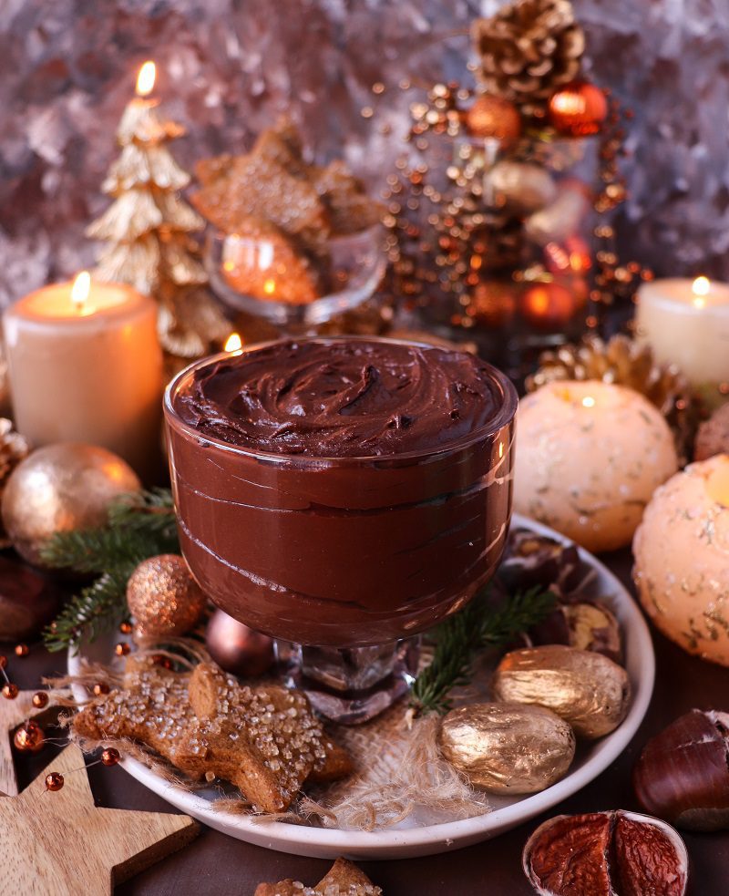 A glass dish filled with thick, glossy chocolate chestnut dessert spread topped with sparkling gingerbread star cookies, surrounded by glowing candles, golden ornaments, and festive Christmas decor for a warm, luxurious holiday setting.