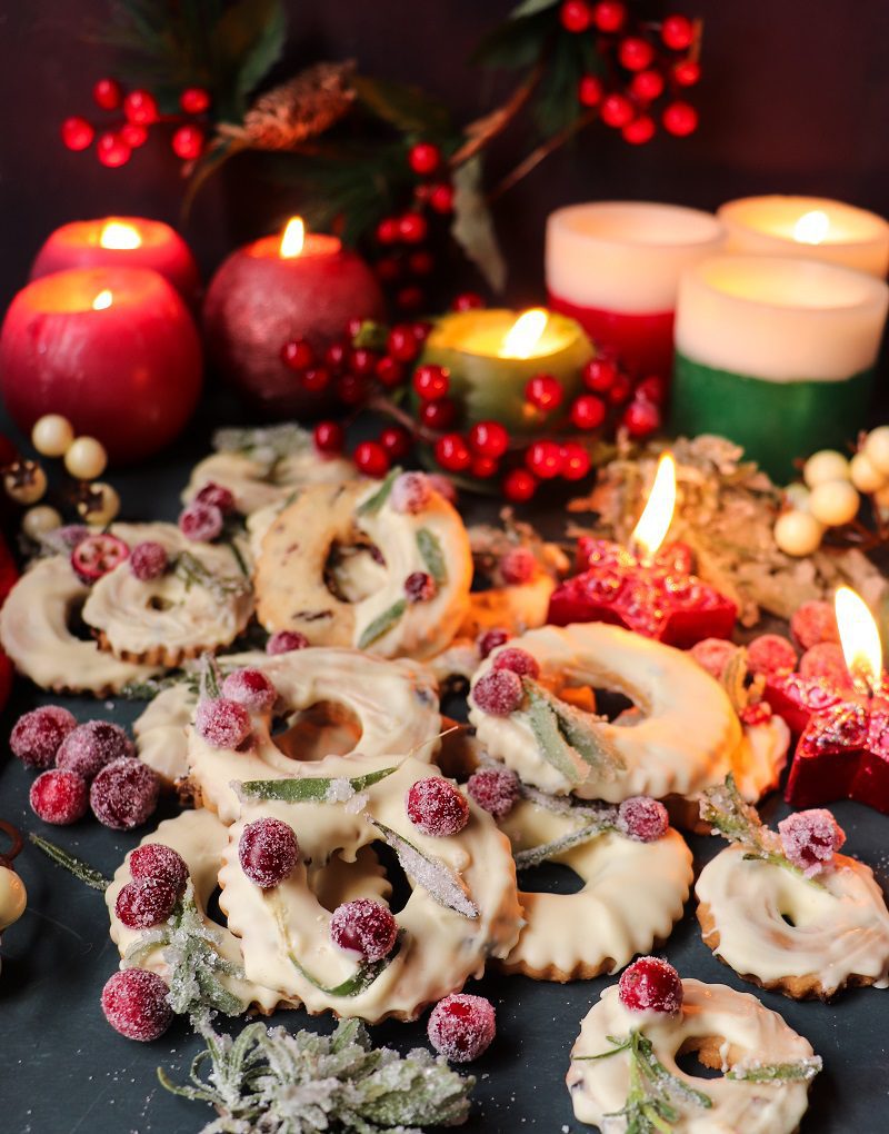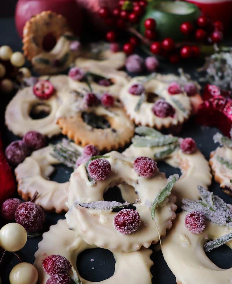 Normally, I am not into decorating my Christmas cookies. But when I saw few ideas for cookie wreaths on the Internet, I could not resist! They look super festive and elegant. Basically, you will only need white chocolate and some sugared cranberries and sugared rosemary (optional).