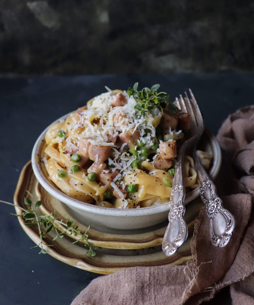 To make this pasta, you will need onion, cooked ham (or prosciutto), green peas, Parmesan cheese, butter, heavy cream, and eggs. Plus salt and pepper. Like in carbonara, the beaten eggs are added into the pasta and sauce adding that unique silkiness that carbonara has. As for pasta type, the traditional way would be fettuccini.