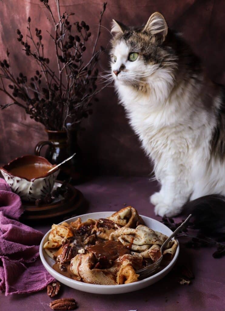 These Crêpes with Dulce de Leche Sauce (and whiskey!) are a rich, smooth, luscious, and boozy. Serve them with a scoop of ice cream and toasted pecans for an ultimately decadent dessert!