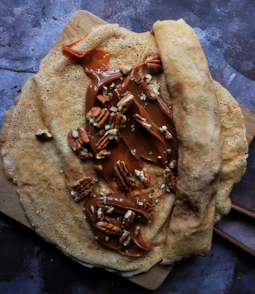 Next, you need to make crepe rolls. I opted for thicker rolls consisting of 2 to 3 crepes. Grab one crepe and spread some dulce de leche and sprinkle with a few pecans. Roll it out and set aside. Take another crepe and spread dulce de leche and pecans. Place the previously rolled crepe and roll them together. Now you have a thick roll. You can stop here and go the extra mile and make a three-layer crepe roll! Then thickly slice them and arrange them tightly in a deep baking dish.