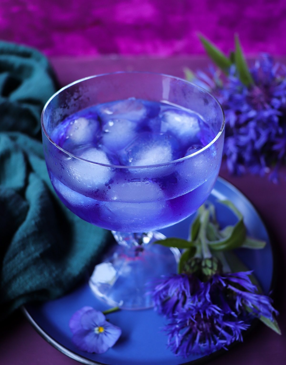 It has a beautiful indigo colour. But once you mix it up with other liquors or juices (Particularly citrus juice), it will change the colour. The hues will vary depending on the pairing – different purple and pink hues from light lavender to vibrant fuchsia.