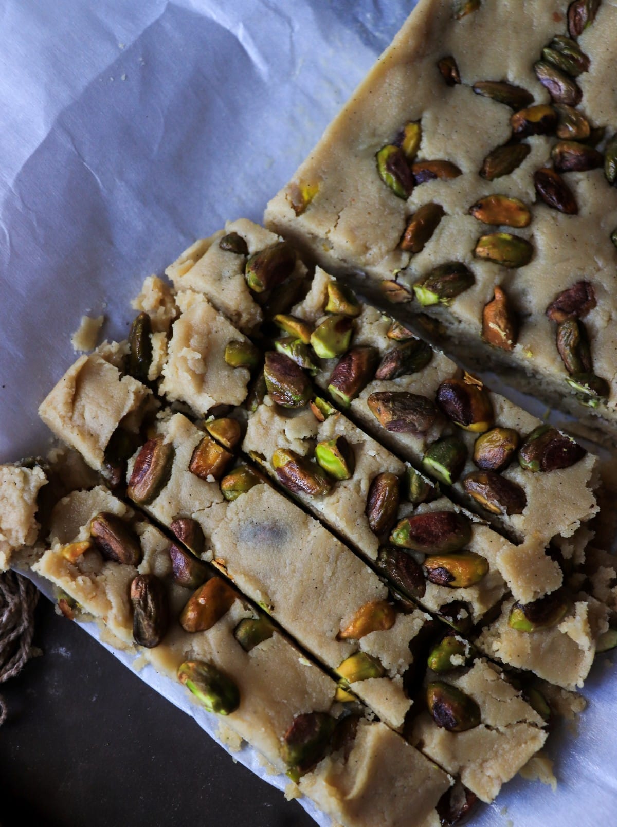 For the best texture, refrigerate it overnight. During this time, the halva will mature, allowing the sugar to crystallize more fully. This results in a firmer texture with a slight chew and delicate sugar threads, along with some natural crumbling.