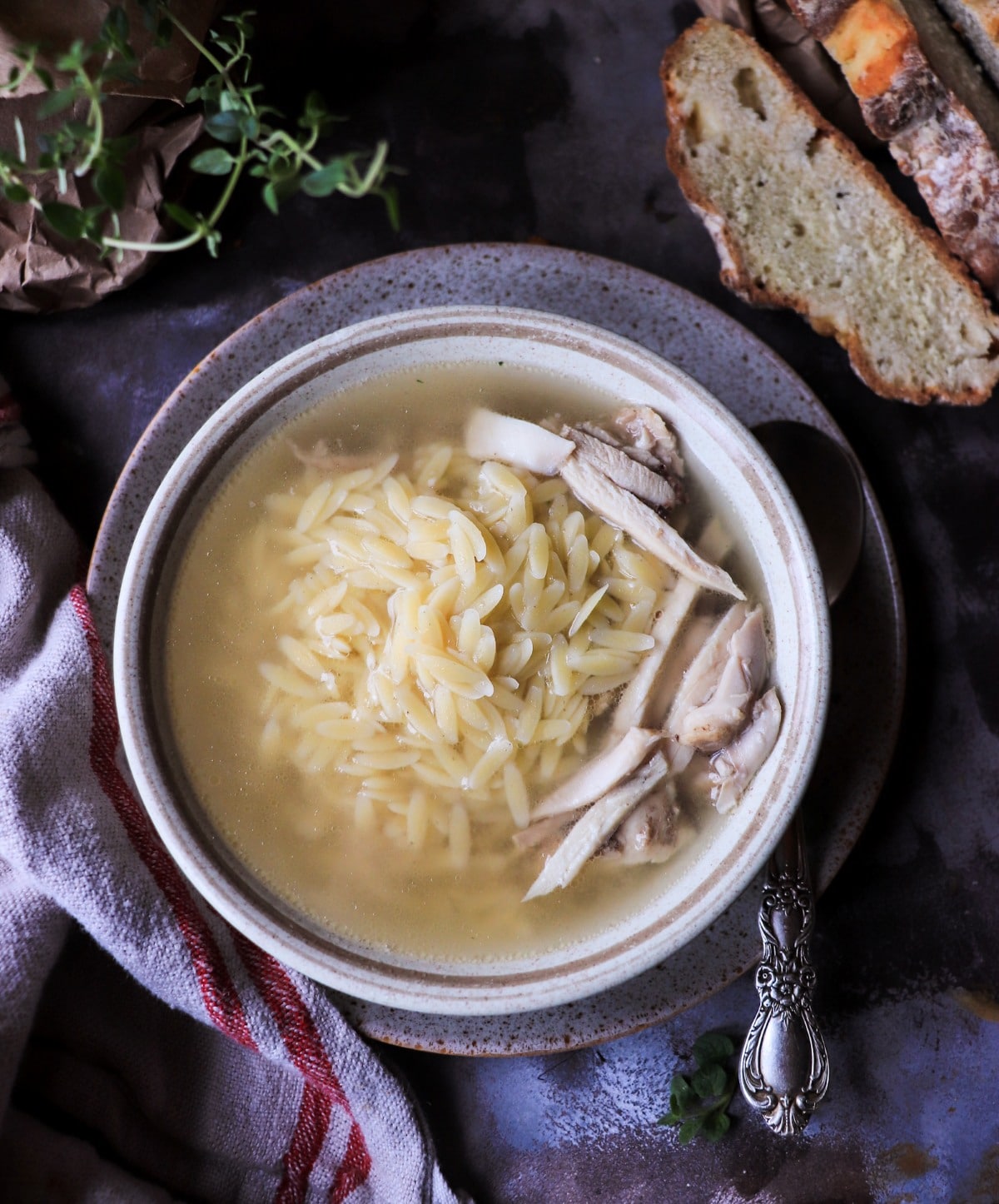 Return the strained broth to a gentle simmer and add the orzo or other small pastina. Cook until tender, stirring occasionally. During the final minute, add the shredded chicken back to warm through. Turn off the heat and stir in finely grated Parmigiano Reggiano. Serve immediately while the broth is clear, light, and brothy.