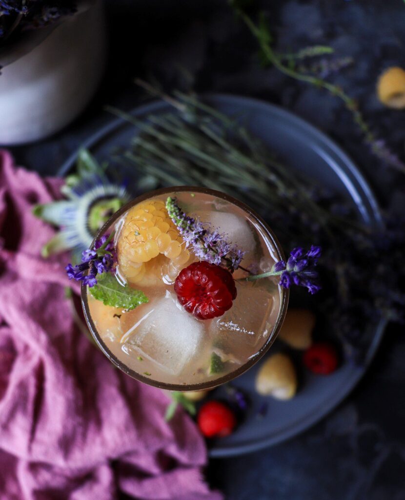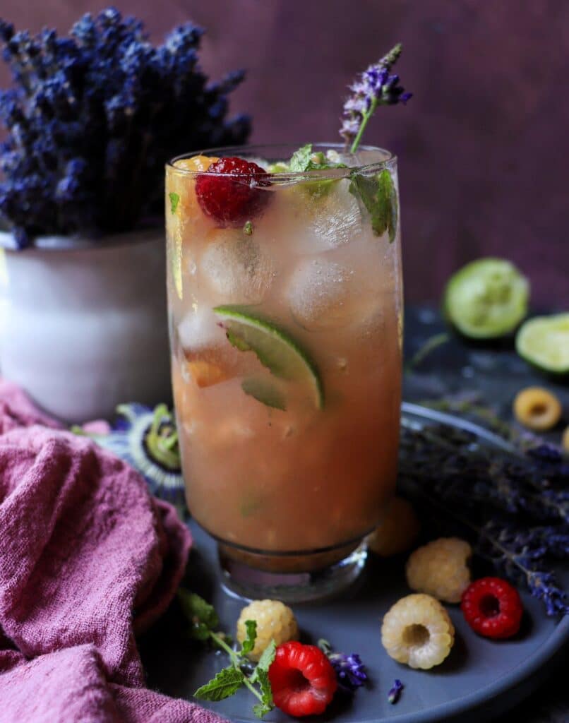 That’s super easy, really. Muddle the raspberries, lime juice, lavender syrup, and mint leaves in a small jug or shaker, crushing the berries and mint with a pestle (muddler). Pour into a glass and add a handful of ice. Pour the rum over, stirring with a long-handled spoon. Top up with soda water (if desired), garnish with more fresh raspberries, lime wedges, and mint, and enjoy!