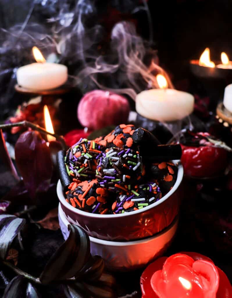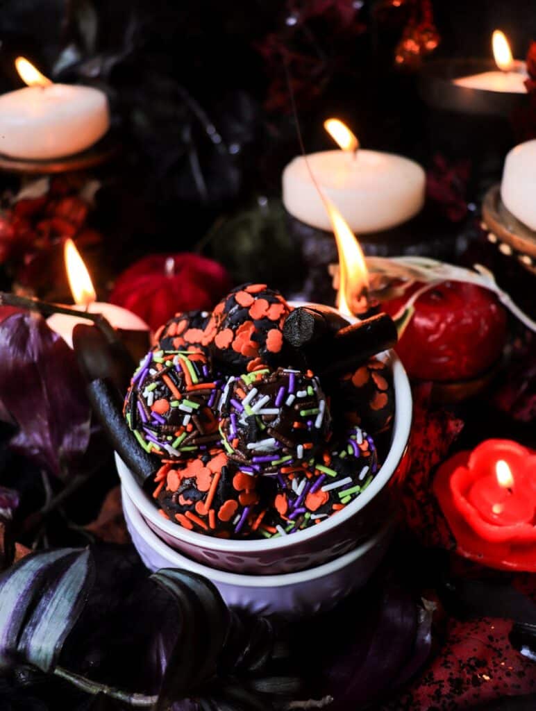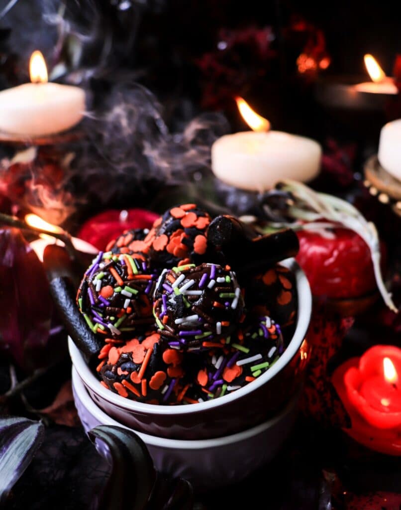 • Chocolate sprinkles (jimmies) – These are used to coat the finished truffles, giving them a traditional look and adding texture to contrast with the fudgy interior. I used Halloween-theme sprinkles.