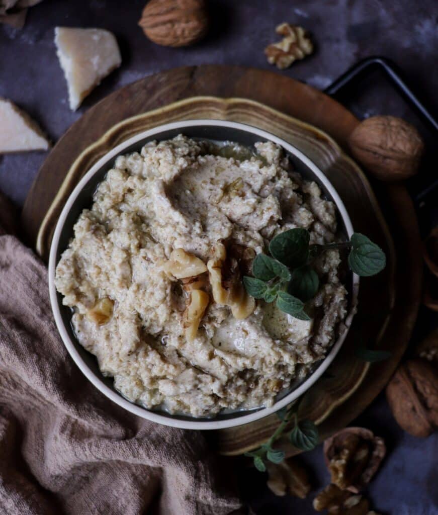 Traditionally, this sauce is made with fresh walnuts. But, of course, you can use dried ones – given that the harvest season typically occurs for a few weeks between late September and early November. Also, dried walnuts should be sweet and as fresh as possible. There is an optional step to boil shelled walnuts for a few minutes which helps remove their skin and makes them taste sweeter. I opted out of this step.