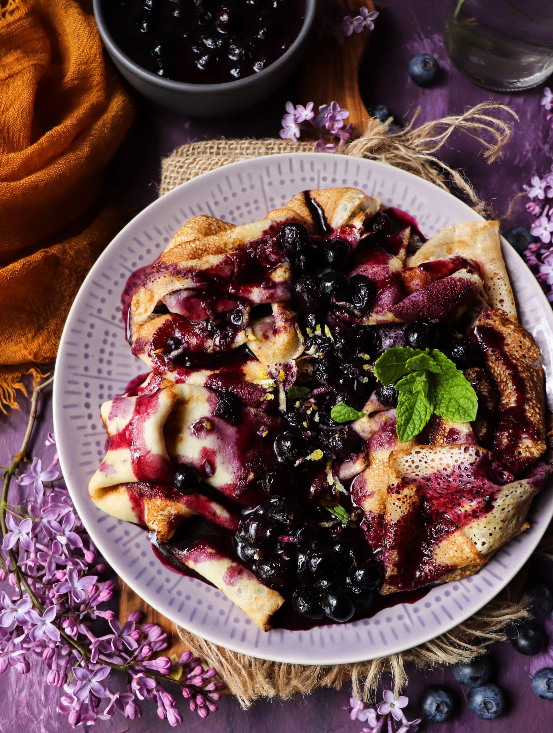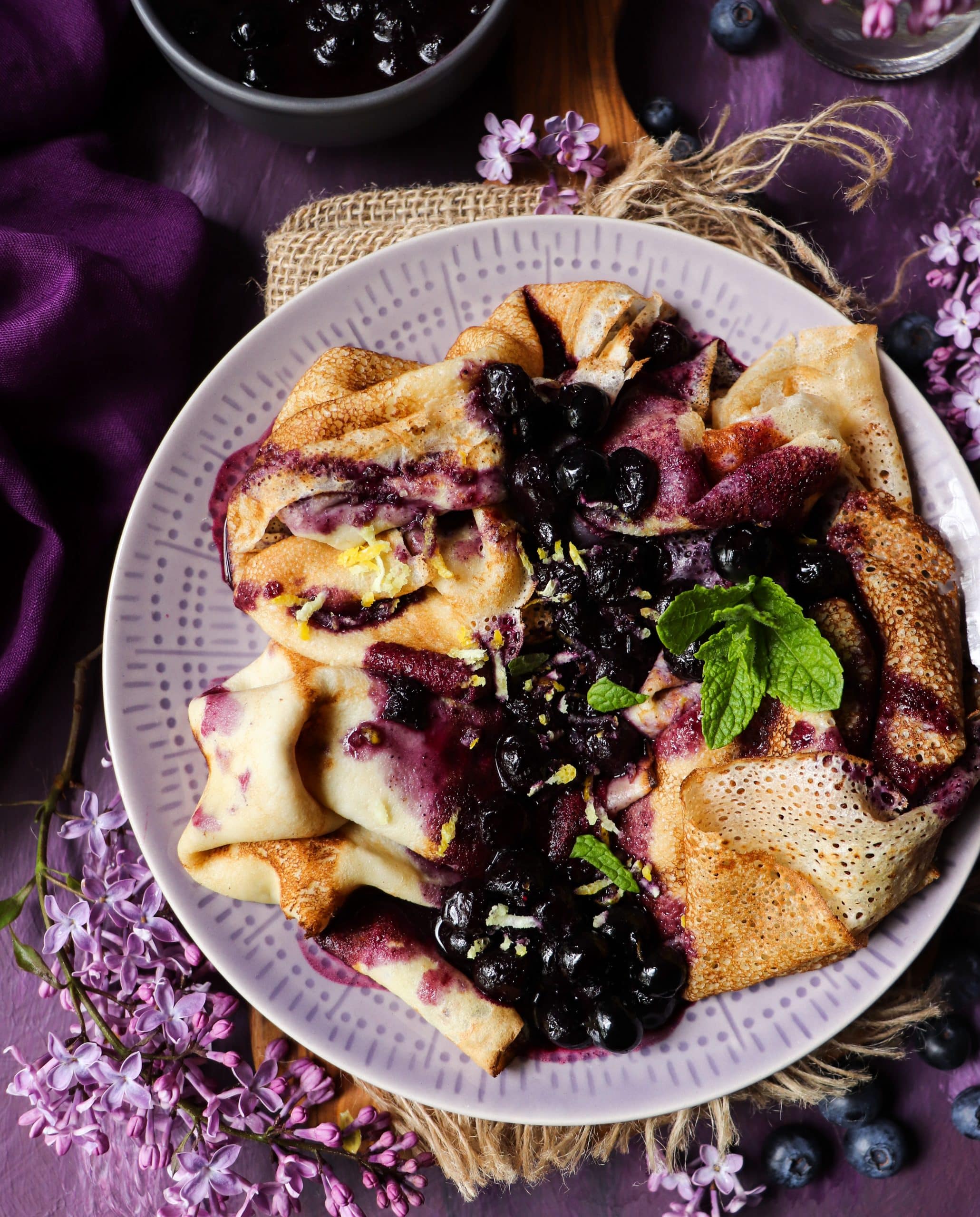 I mean, imagine a luscious blueberry sauce bursting with flavour. Maple syrup adds sweetness and those autumn vibes (Even though we enjoyed the crepes back in June. See the lilacs? lol) Lemon adds freshness and balances out the sweetness. And bourbon what about it? It’s always great. You won’t feel it much here, but there’s something warming and cozy about this addition.