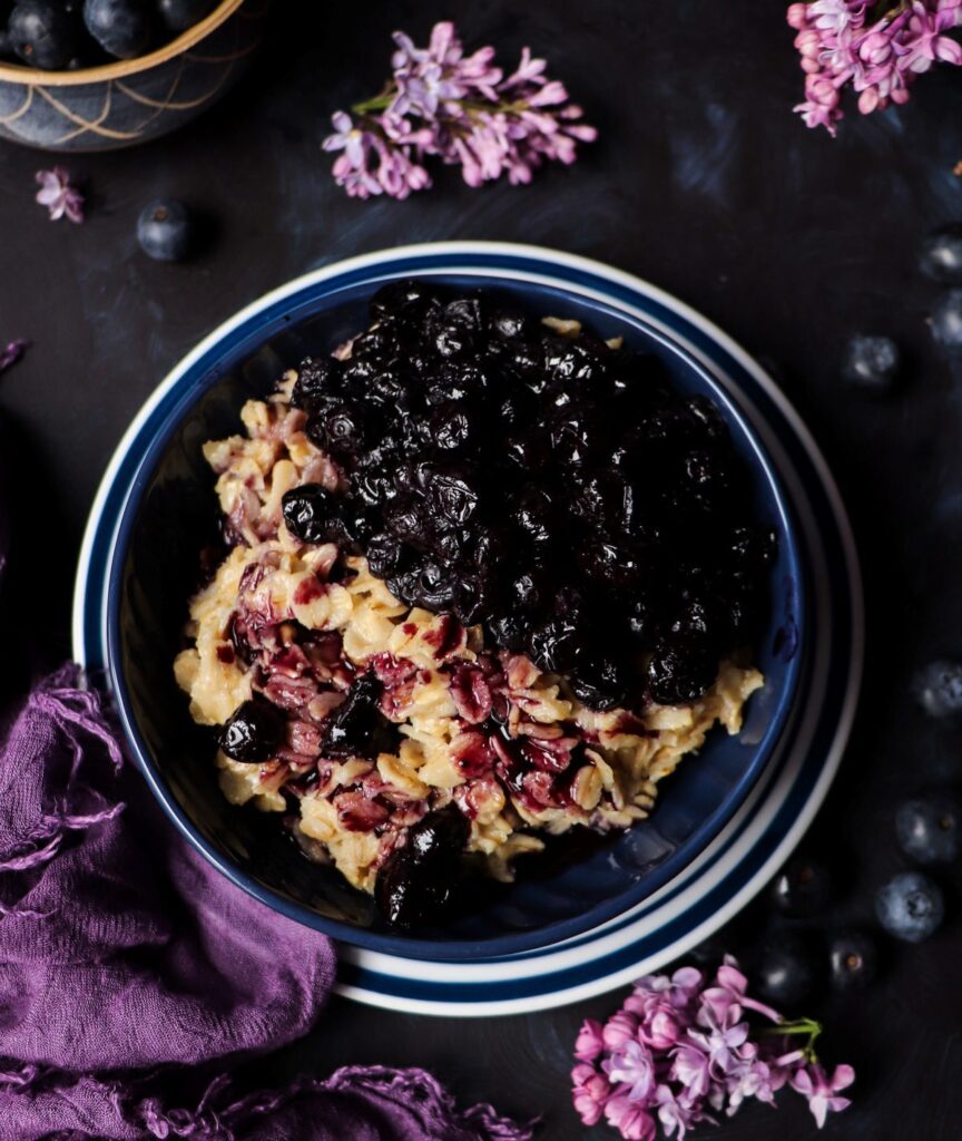 This Oatmeal with Blueberry Sauce with maple syrup and lemon is a hearty yet fresh and luscious porridge recipe to enjoy this summer.