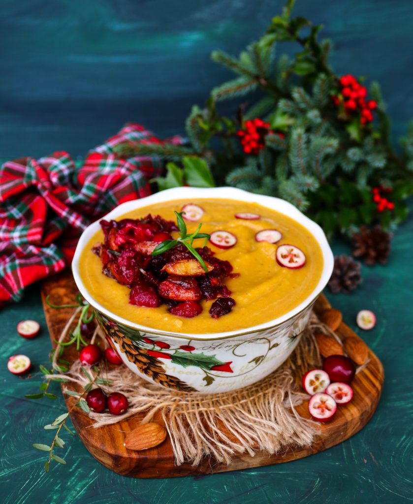 This Pumpkin Cranberry Soup with a cranberry relish, rosemary, parmesan, and nutmeg is a aromatic, delicious, and festive recipe for your holiday celebration!