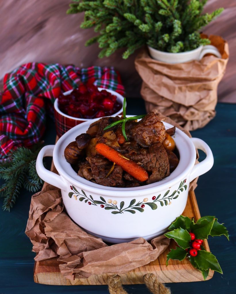 This Beef Mushroom Chestnut Stew with red wine, dried cranberries, and rosemary is a delicious recipe suitable for any festive celebration.