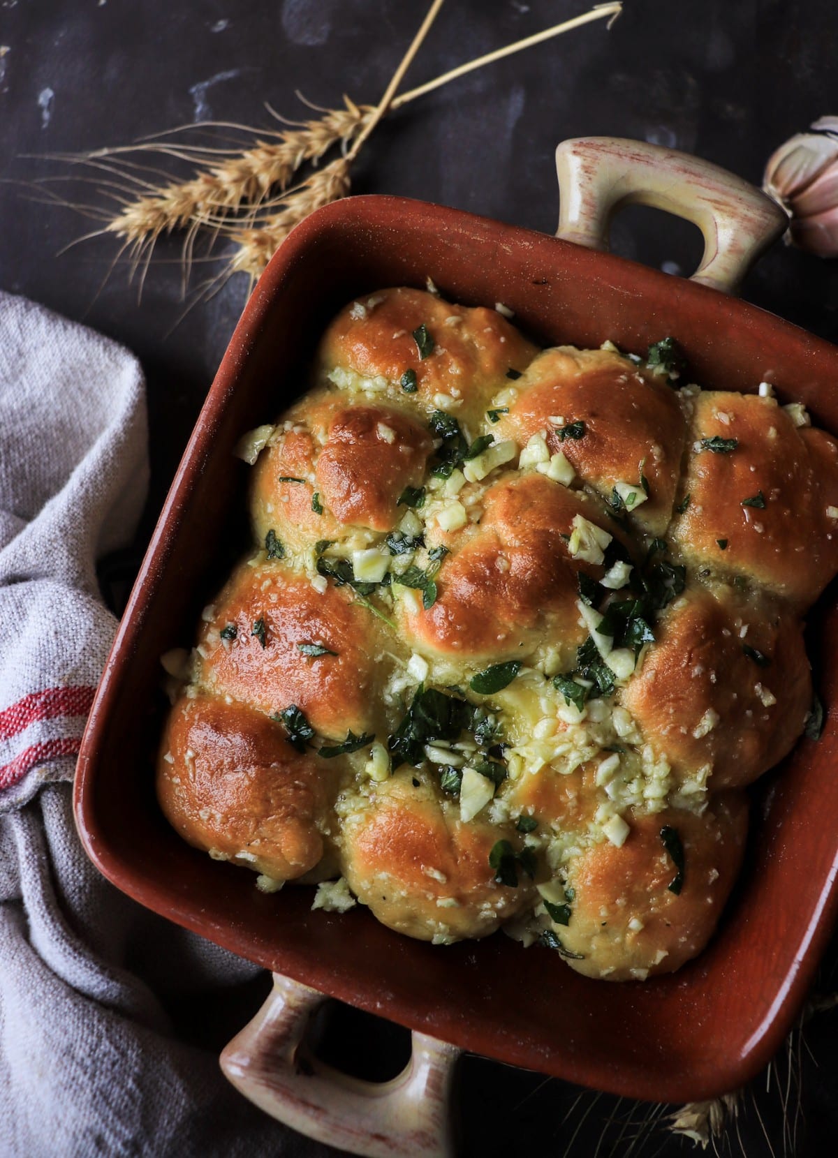 If you do use store-bought or pizza dough, the most important thing is still the same: divide it into small portions, arrange the pieces close together, and finish generously with the garlic topping while hot.