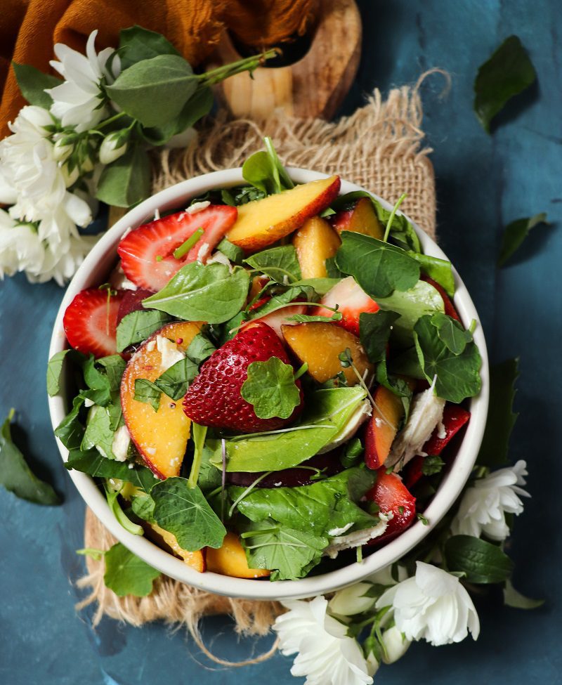 This Peach Strawberry Salad is simple in terms of flavours and textures, but it’s super tasty. Succulent peaches and refreshing strawberries make an excellent combination. I also added nasturtium leaves (which are totally edible as well as other parts of this flower). If you’ve never tried them, you definitely should. They have a nice peppery and robust kick, which reminds me a cross between arugula and water cress.