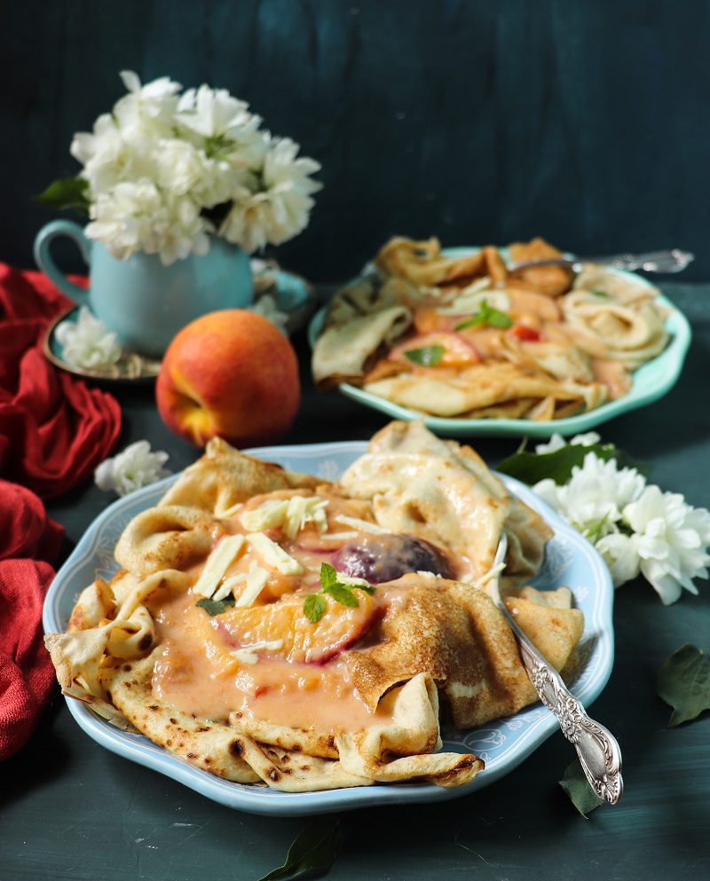 Most of you mentioned that the cherry season is over in your areas of living, but I think it does not apply to peaches. At least here in Canada, we are going to have some awesome local peaches soon. Plus, we still have imported beautiful fruit in the stores. So, I hope you can enjoy these Peaches and Cream Crêpes with me.
