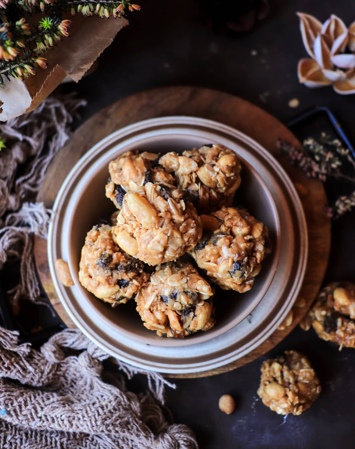 Peanut butter oat bites with cornflakes, maple and raisins in a rustic bowl.