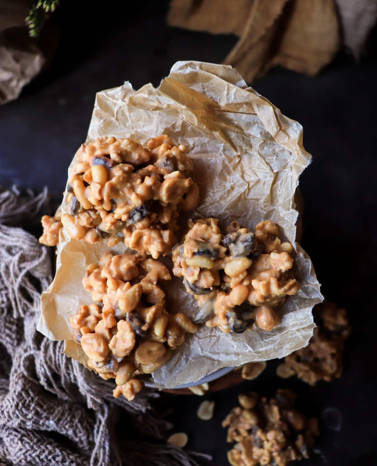 These clusters are very similar to traditional peanut butter haystacks, which are typically made with butterscotch chips, peanut butter, and cornflakes. However, this version includes toasted pine nuts, salted peanuts, raisins, and vanilla bean paste, which add more depth and texture.