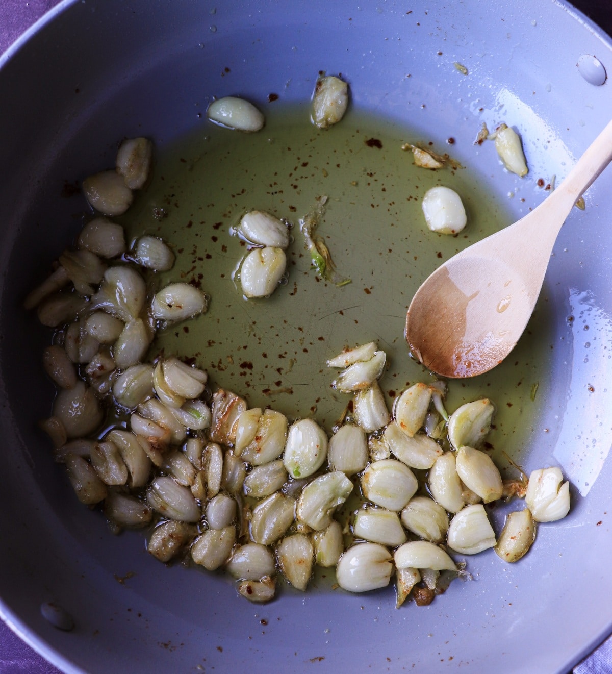 - Lower the heat and add the whole garlic cloves, allowing them to soften gently without burning.