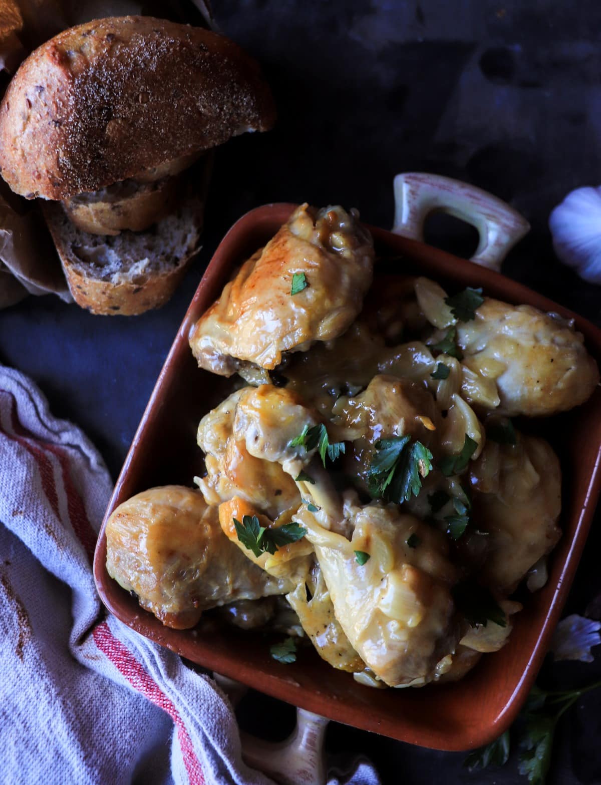 This Spanish garlic chicken is bold yet balanced. The garlic becomes sweet and mellow as it slowly cooks in olive oil, while the white wine provides gentle acidity to lift the richness.