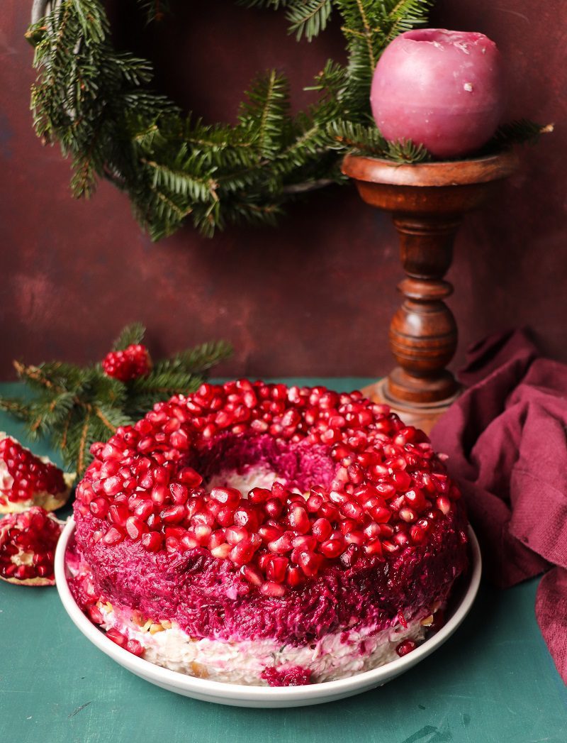 It is possibly that the salad owes its name to a famous novel “The Garnet Bracelet” written by the Russian writer Alexander Kuprin. What’s the connection? “Garnet” and “Pomegranate” are the same word in Russian. Besides, garnet gemstones are so beautiful and resemble pomegranate arils.