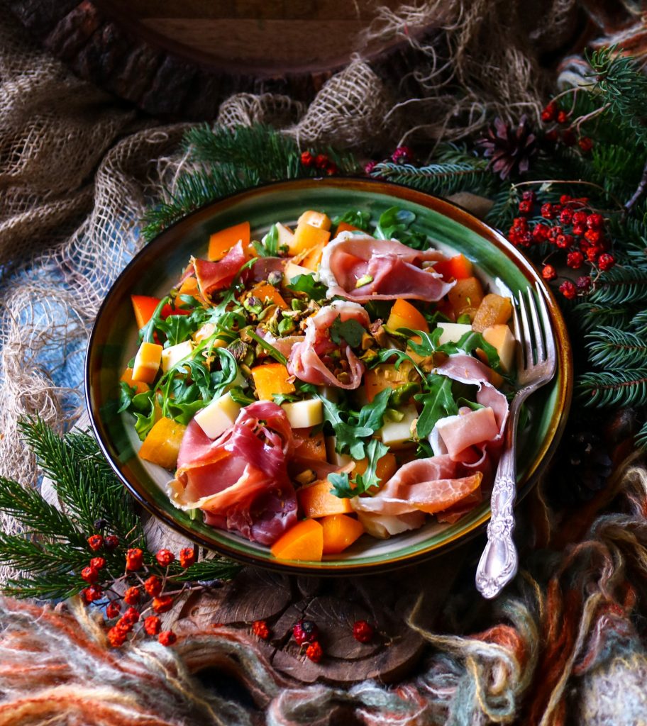 This Persimmon Prosciutto Smoked Cheddar Salad with salted pistachios and light honey dressing is packed with flavour and texture!
