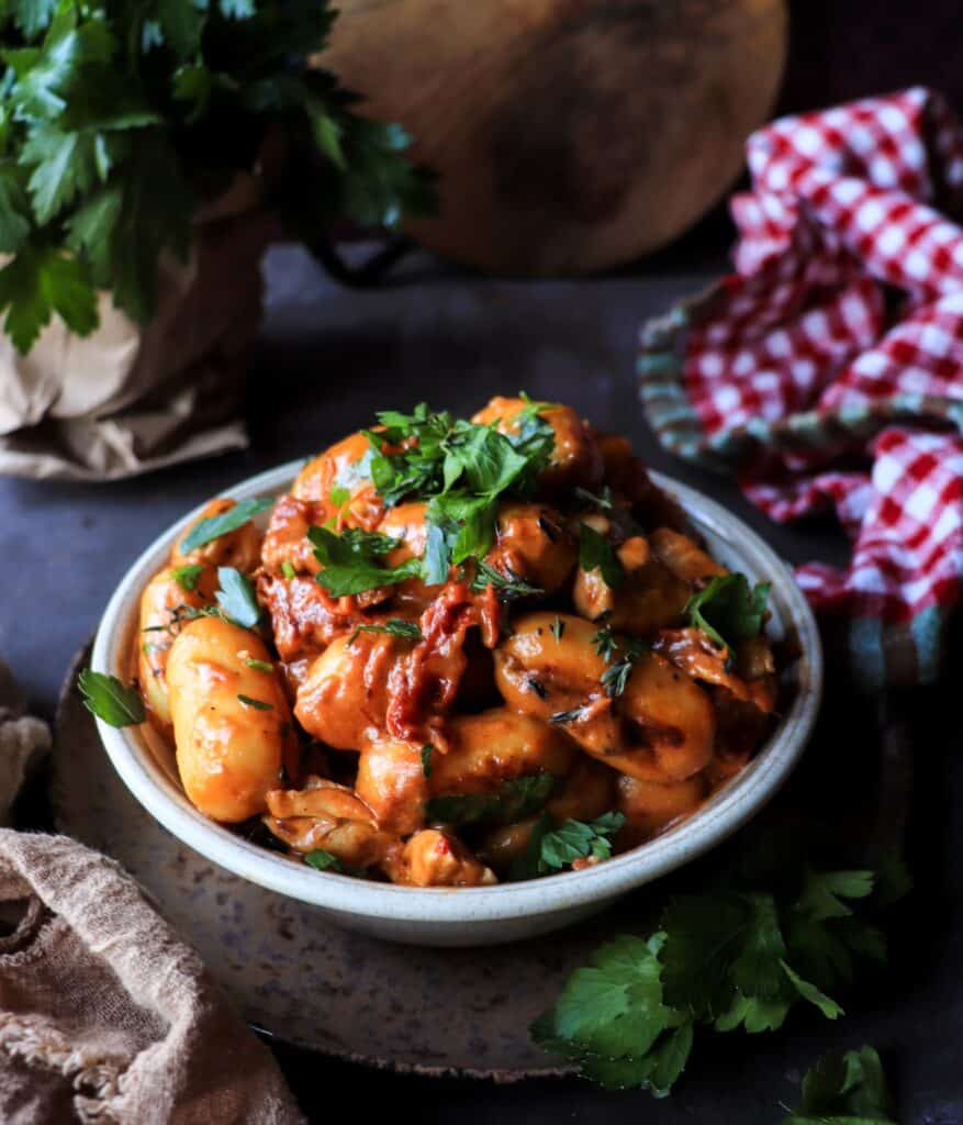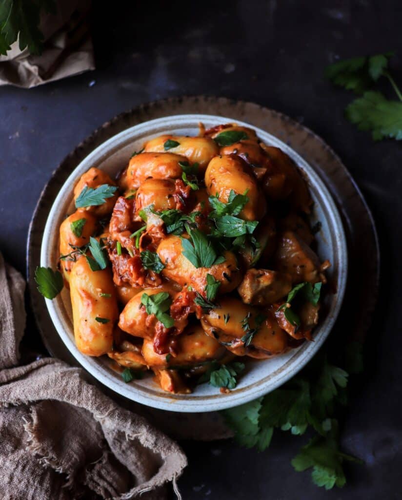 This skillet gnocchi with Marry Me chicken sauce is rich, savoury, and deeply comforting, with layered flavours built entirely on the stovetop. The sauce is creamy and velvety, infused with garlic, sun-dried tomatoes, and Parmesan, while smoked paprika and chipotle add gentle warmth and a subtle smoky undertone rather than overt heat. The chicken stays tender and juicy thanks to the quick, bite-sized cooking method, and the gnocchi are lightly seared while staying soft and pillowy, working beautifully with the silky sauce. Overall, the dish strikes a balance between indulgent creaminess, savoury depth, and soft, pillowy textures – perfect for cozy dinners and special occasions alike.