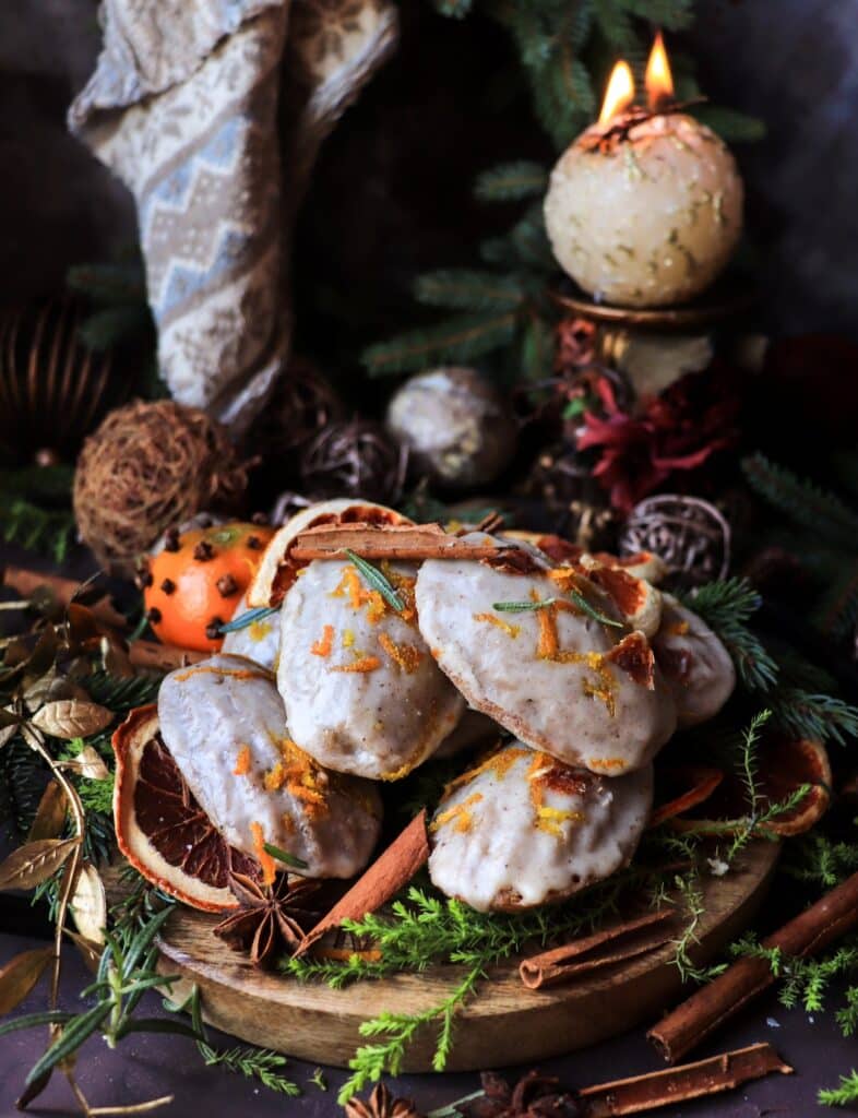 Spiced orange madeleines with brandy glaze arranged on a festive wooden board with dried oranges, cinnamon sticks, and evergreens.
