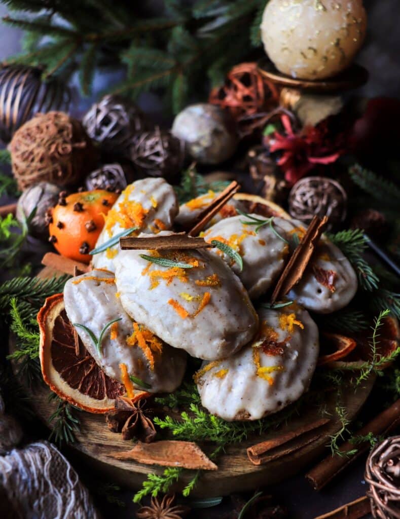 Spiced orange madeleines with brandy glaze, including one madeleine cut open to show the tender spiced crumb, styled with dried citrus, rosemary, and festive holiday decor.