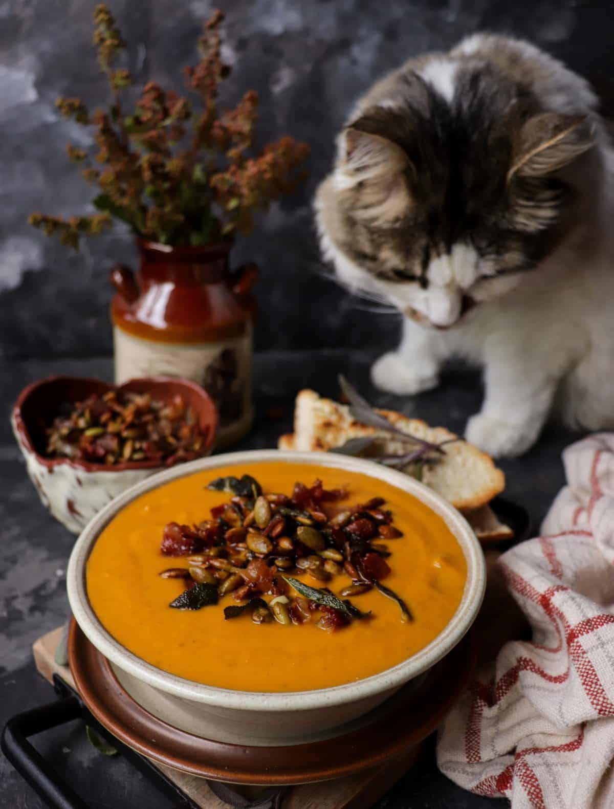 Such a creamy and delicious soup, perfect for cozying up! The sage adds so much aroma and flavor along with the crispy prosciutto!