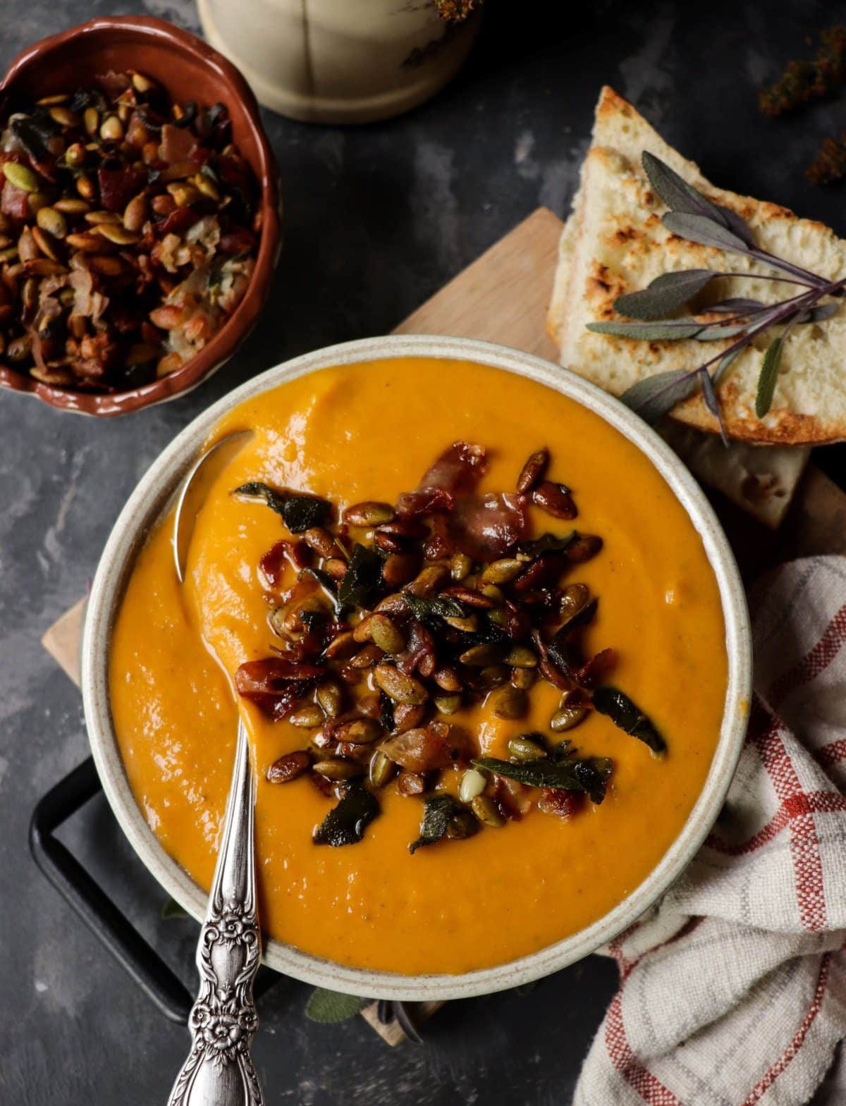 This Sweet Potato Soup with Prosciutto Sage Topping is hearty, creamy, and delicious. And the savoury and herbaceous topping made with crispy prosciutto, pumpkin seeds, and sage would elevate even a simple soup recipe to a completely different level of deliciousness!