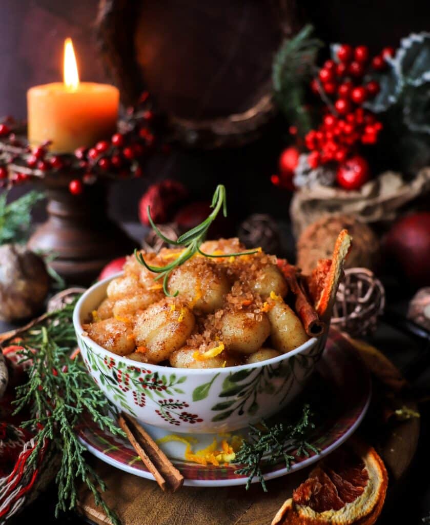 Festive sweet skillet gnocchi in a Christmas bowl topped with coarse sugar, citrus zest, and rosemary, with holiday decorations, red berries, and a glowing candle in the background.