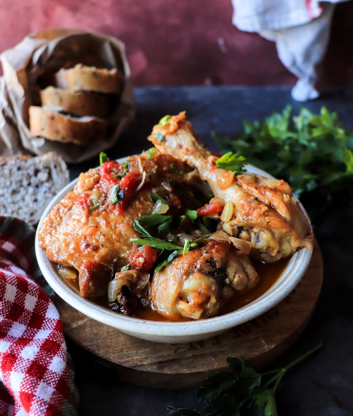 Traditional Chicken Cacciatore (Pollo alla Cacciatora) in a rustic ceramic bowl with tomato sauce and fresh parsley, styled on a wooden board with red cloth.
