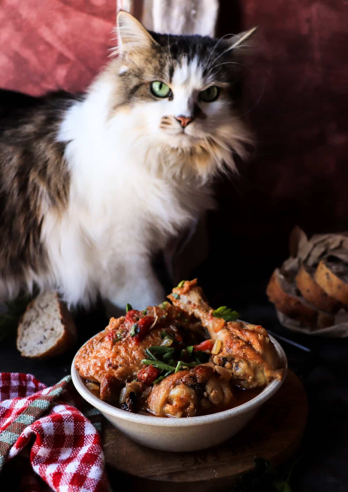 Daisy the cat leaning toward a bowl of Traditional Chicken Cacciatore with tomato sauce and parsley garnish.