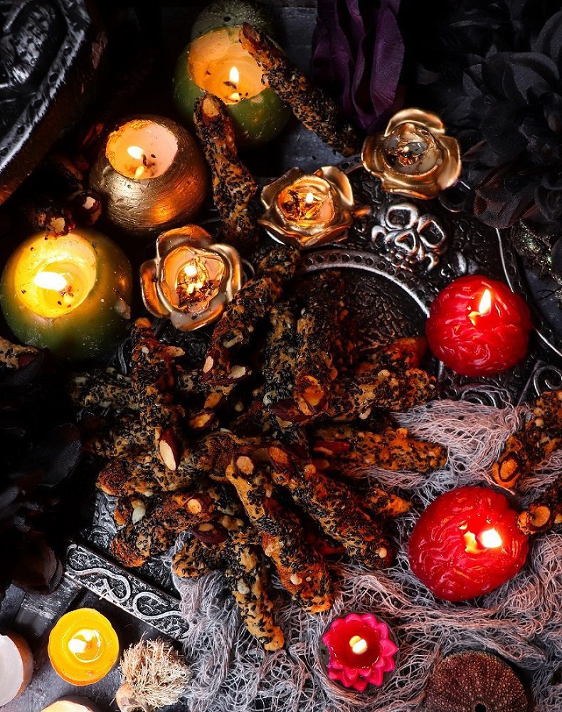The solution turned out to be easy. Last year I shared the recipe for these Witches’ Fingers Cheese Biscuits. So, I decided to use the same idea, but also roll the biscuits in black sesame seeds before baking them.